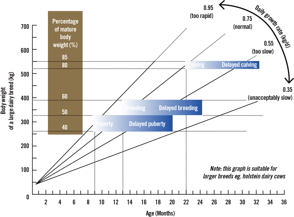 How calves are reared will set the tone for the lifetime productivity of the animal; well-reared calves will be an asset to the herd. The following graph shows the goals for growth rates of calves and the impact on reproductive performance. Calves today are tomorrow’s herd, so it makes economic sense to give them the best possible start to life by using the best calf rearing techniques, and top quality feeds.