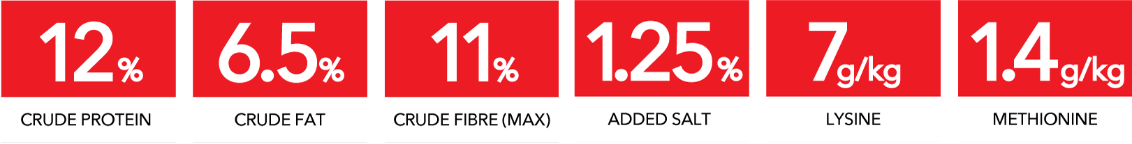 Micronised and Steam Rolled Lupins, Barley, Oats and Maize, Lucern, Black Sunflower Seeds, Molasses, Vegetable Oils, Salt, Calcium Carbonate, Di-Calcium Phosphate, Potassium Chloride, Magnesium Oxide, FeedRite Vitamin and Trace Mineral Premix (with Bio-Available Organic Trace Minerals), Lysine, Yeast Products, Choline Chloride.